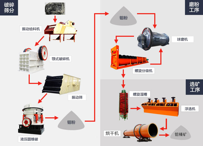 大塊的鉬礦石經(jīng)料倉由振動給料機(jī)均勻地送進(jìn)顎式破碎機(jī)進(jìn)行粗碎;粗碎后的鉬礦石經(jīng)過振動篩篩分后,由皮帶輸送機(jī)送到液壓圓錐式破碎機(jī)進(jìn)行細(xì)碎;