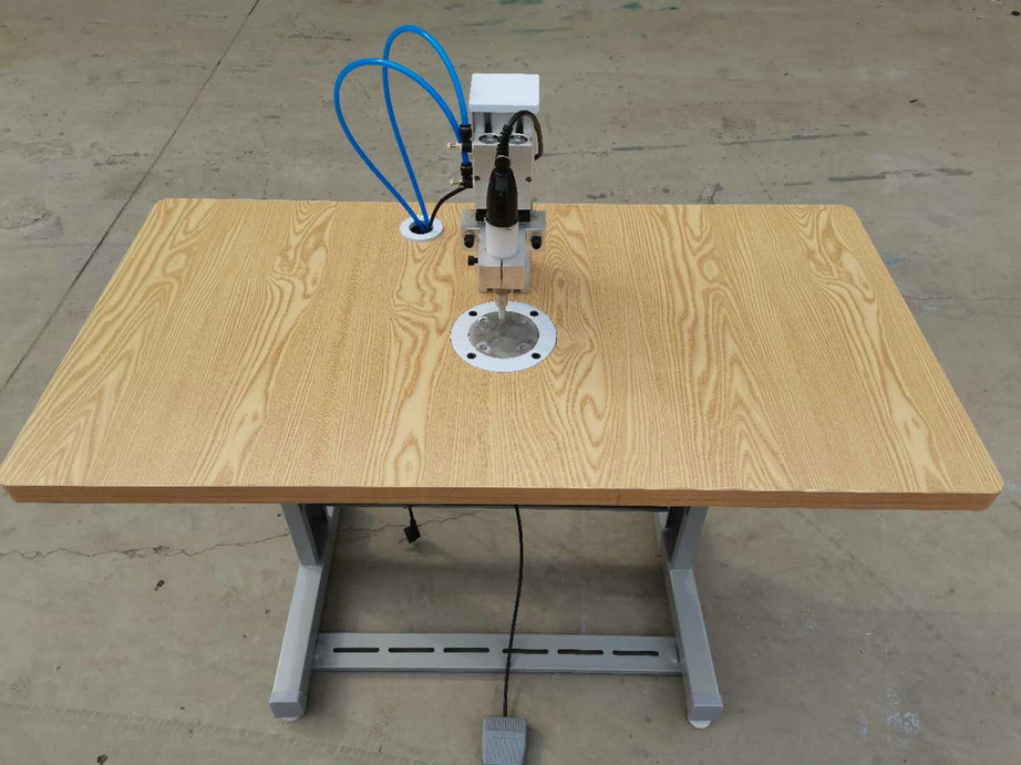 本機以超聲波將綁帶融合于口罩本體兩側,進而完成綁帶式口罩成品,只需一名操作員將口罩片置于超聲波發(fā)生器的頭上,后將綁帶放在口罩片上,腳踏踏板使氣缸向下運動,縫住綁帶和口罩片。